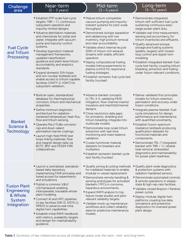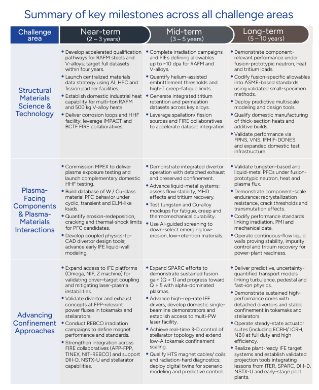 Each Challenge Area includes specific technical milestones—for example, demonstrating structural materials that maintain performance after irradiation to 20 dpa by 2028, or validating integrated blanket modules in prototypic neutron environments by 2032.