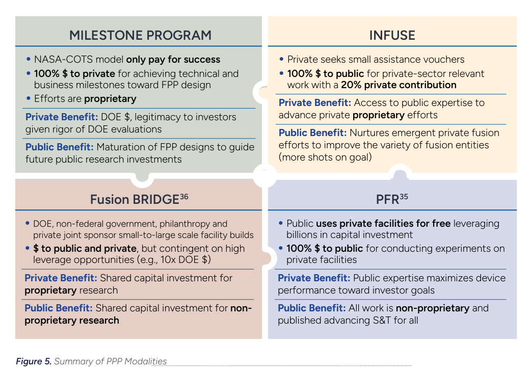 - Expanding Public-Private Partnerships - Building on the success of the Milestone-Based Fusion Development Program, which has awarded cost-shared partnerships to eight companies pursuing diverse fusion concepts, the roadmap calls for expanded partnership programs. These include the Innovation Network for Fusion Energy (INFUSE) program, which provides companies with access to national laboratory capabilities, and emerging frameworks, such as the Public-Private Consortium Framework, that enable cost-effective access to DOE experimental facilities.