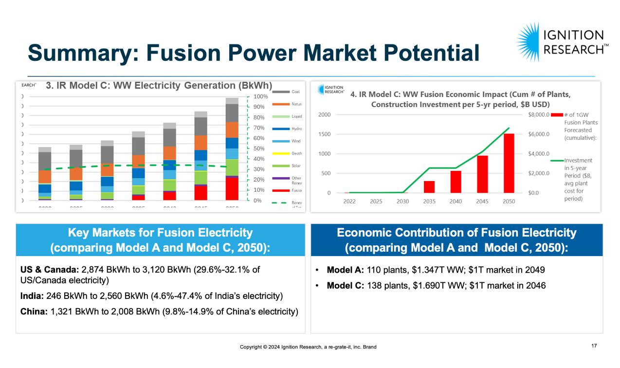 Fusion energy's unique ability to provide directly dispatchable 24/7 power positions it as a crucial solution for meeting the growing energy demands of the future. As the only green electricity source that can seamlessly replace current water-heating power plants, fusion is set to play a pivotal role in the future energy landscape. This potential could lead to its trillion-dollar market valuation by 2050. Ignition research predicts that in 2050, fusion energy could produce up to 24% of global electricity and that ~1000 fusion-based power plants would be required at 1GW/machine.